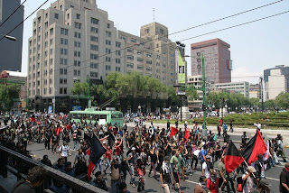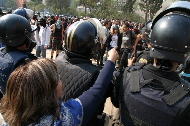 As fortes medidas policiais isolaram os anarquistas do resto dos manifestantes por meio de um encapsulamento de forças antidistúrbios. Graças à mediação e à pressão de outros companheiros e a solidariedade do sindicato SME (Sindicato Mexicano de Eletricistas), que estavam fora do cerco, foram capazes de acabar com o bloqueio, mas sem antes de ter encontrões com a polícia e ter que cortar as ruas do centro da Avenida Reforma. Assim a marcha pode acontecer sem mais contratempos, culminando na grande praça central de Zocalo, com vários discursos de companheiros anarquistas.