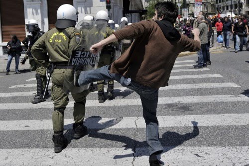 O governo socialista grego mandou um forte contingente para a rua para controlar os protestos, que juntou trabalhadores, pensionistas, desempregados, imigrantes, estudantes, comunistas e anarquistas.